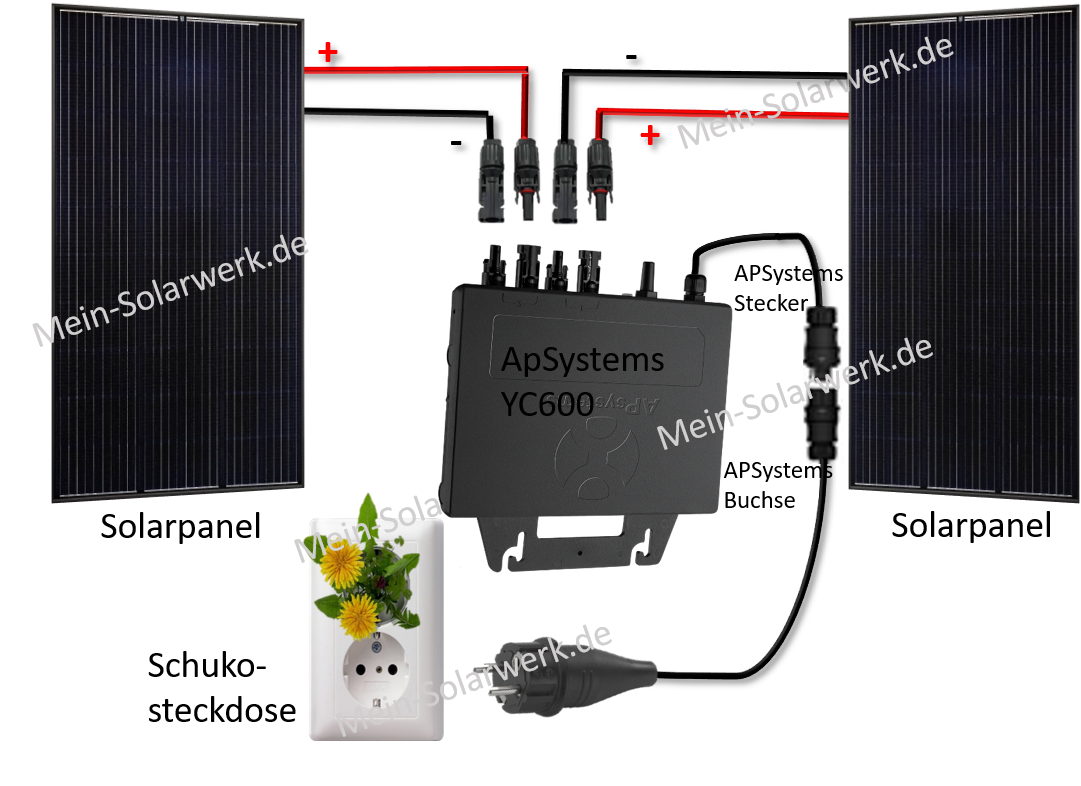 Mit maximal 600VA Ausgangsleistung werden stromverbrauchende Geräte direkt mit dem selbsterzeugten Strom aus der Steckdose versorgt. Rechtskonformität in Deutschland ist gegeben durch die 600 Watt Wirkleistung (Nennleistung bei Nennbedingung). Überproduzierter Strom fließt in das öffentliche Stromnetz und lässt, solange sie noch einen alten Drehstromzähler haben diesen langsamer bzw. rückwärts laufen.