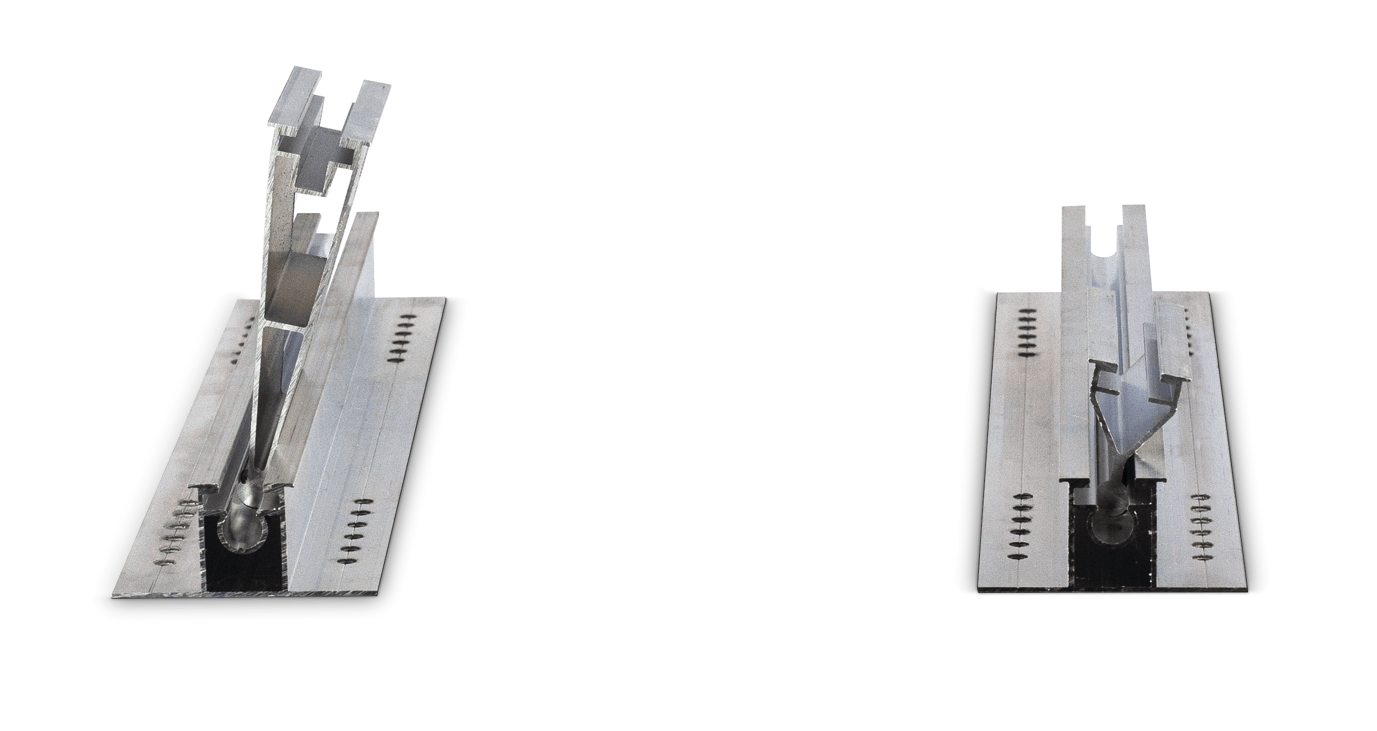 The trapezoidal sheet metal mounting base is ideal for watertight installation on the raised beads of trapezoidal sheet metal roofs. A solar module is installed directly on the trapezoidal sheet metal bridge. Optionally, adapter feet can be inserted into the rail and an additional inclination of 5 or 7 degrees is achieved. By clamping on the long side of the module frame, the module maintains the best possible load capacity.