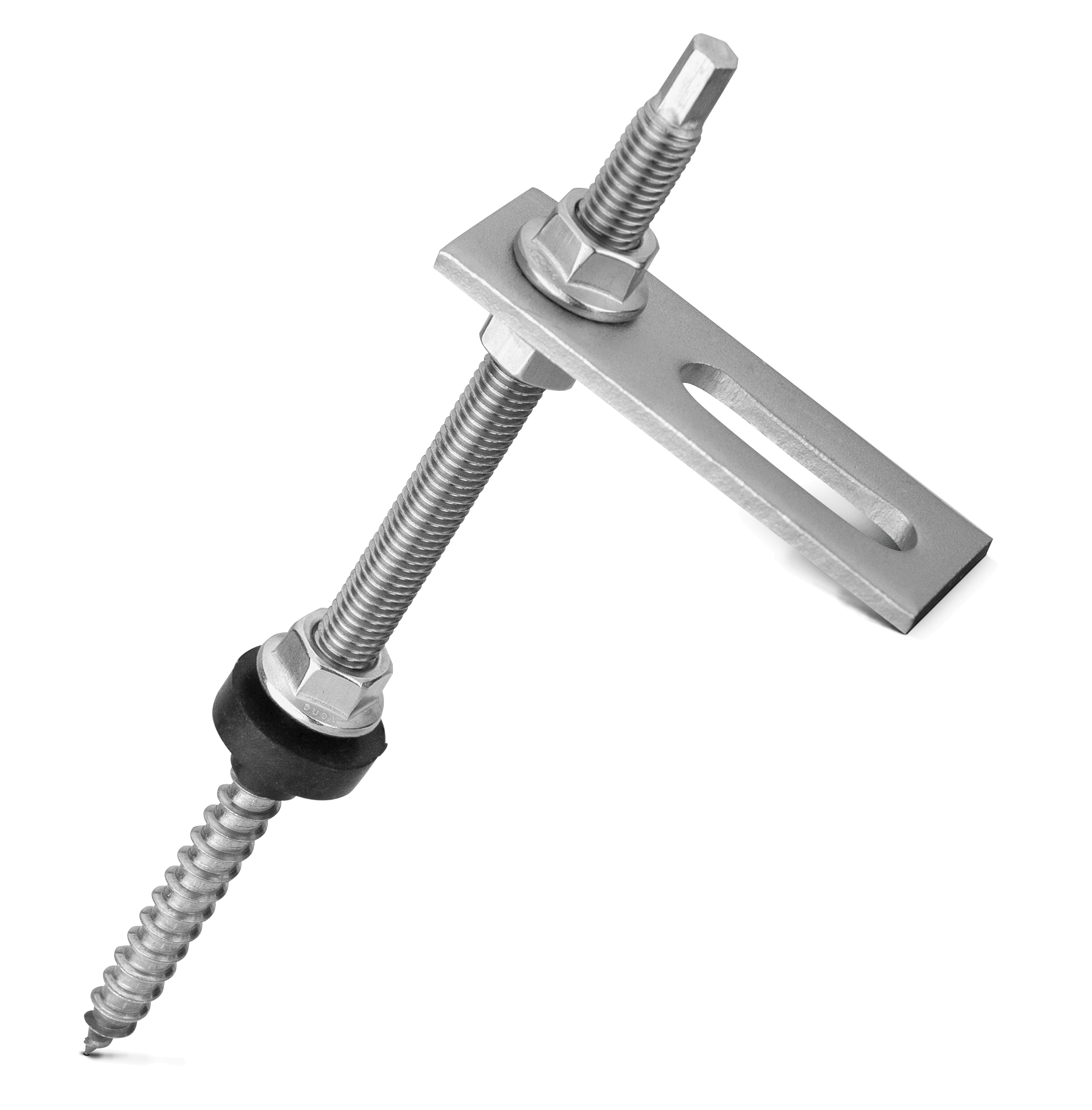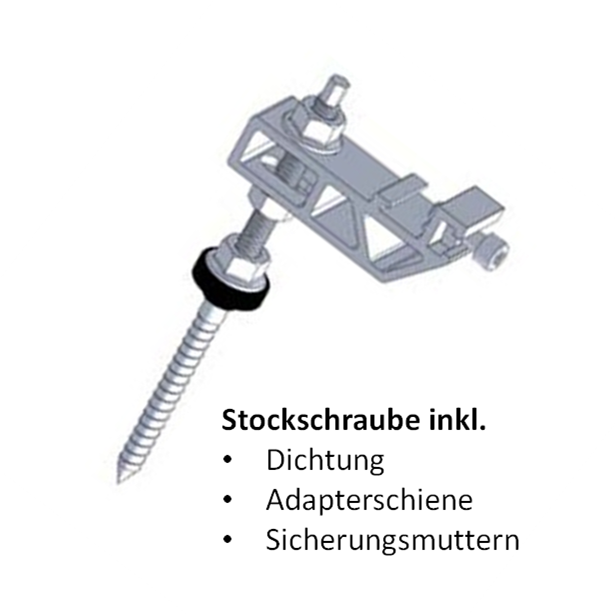 Stockschrauben eignen sich perfekt zur wasserdichten Installation auf Dächern mit Holzunterkonstruktion, als auch Stein bzw. Betondächern. Ebenso können Stockschrauben prima an Fassaden eingesetzt werden. Auf der ein der einen Seite verfügt die Stockschraube über ein Holz- bzw. Dübelgewinde und auf der anderen Seite ein Metallgewinde. Das extralange Metallgewinde bietet genügend Flexibilität zur Höhenregulierung. Die Montage erfolgt mit einem handelsüblichen Schrauber und Schlüsselaufsatz Sechskant. Hier das passende